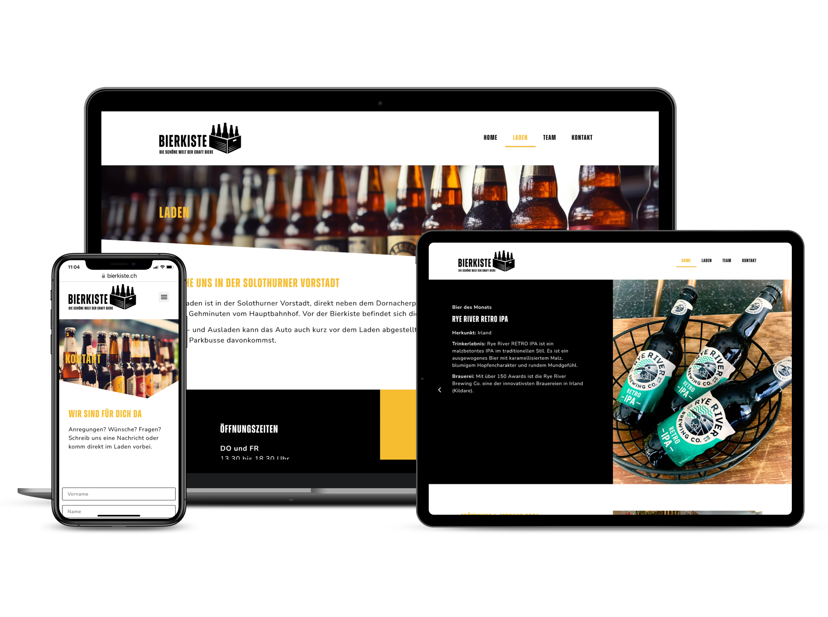 Die Bierkiste lädt mit ihrem grossen Angebot zu einer Entdeckungsreise in die Welt der Biere ein. Regelmässige Events und Degustationen werden ebenso angeboten wie stets fachkundige Beratung durch Sommeliers. Das Projekt umfasste einen neuen Webauftritt im Stil einer digitalen Visitenkarte.