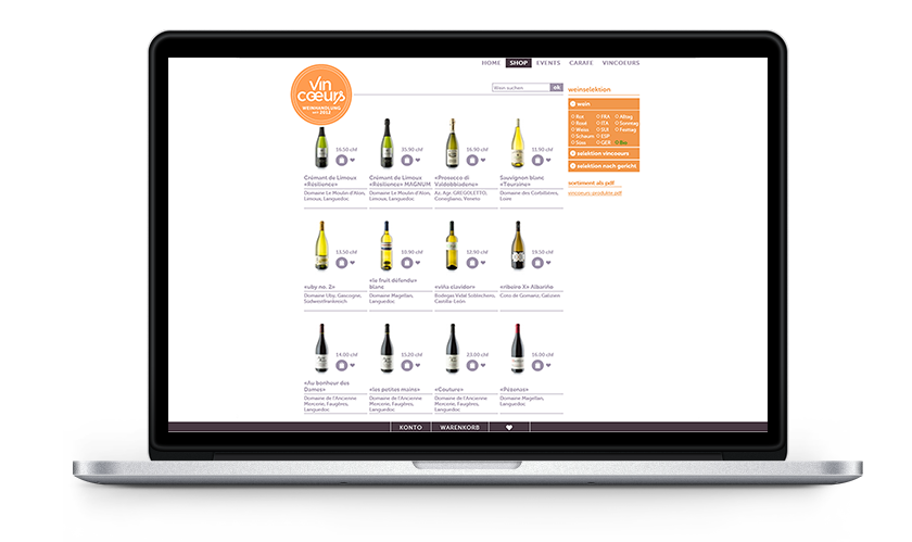 Der Online-Shop bildet für die Vincoeurs GmbH nun das Zentrum ihrer Multichannel-Strategie. Das breite Spektrum an Weinen und Getränken ist jederzeit online abrufbar: Die Filterfunktion unterstützt den Benutzer bei der Suche nach Regionen, Preissegment, Farben oder Anlass. Dank der strukturierten, kundenorientierten Lösung verfügt die Vincoeurs GmbH nun über eine erweiterbare und leistungsfähige Verkaufsplattform.