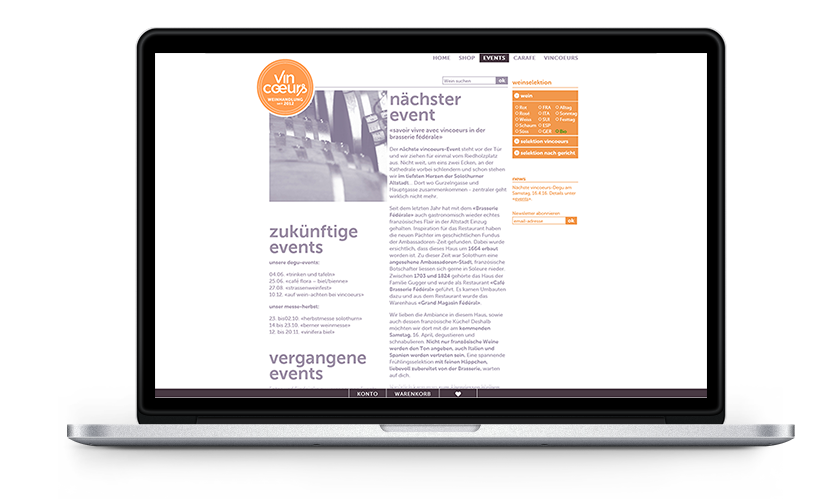 Die Vincoeurs GmbH besteht aus zwei eigenständigen Weinhandlungen. Durch einen Relaunch der Online-Präsenz sollten diese einen gemeinsamen Onlineshop erhalten und die zahlreichen Angebote auch im Web verfügbar gemacht werden. Neben dem bestehenden Geschäft soll der Onlineshop damit eine zusätzlichen Vertriebsplattform darstellen.