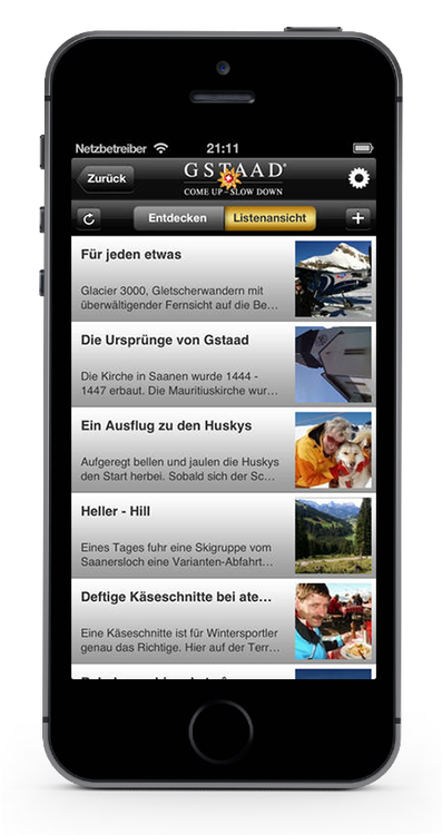 Gstaad Saanenland Tourismus wünschte sich eine mobile App, welche direkt mit der mobilen Website verbunden ist. Die webgearing ag half beim Design und der technischen Umsetzung von iGstaad.