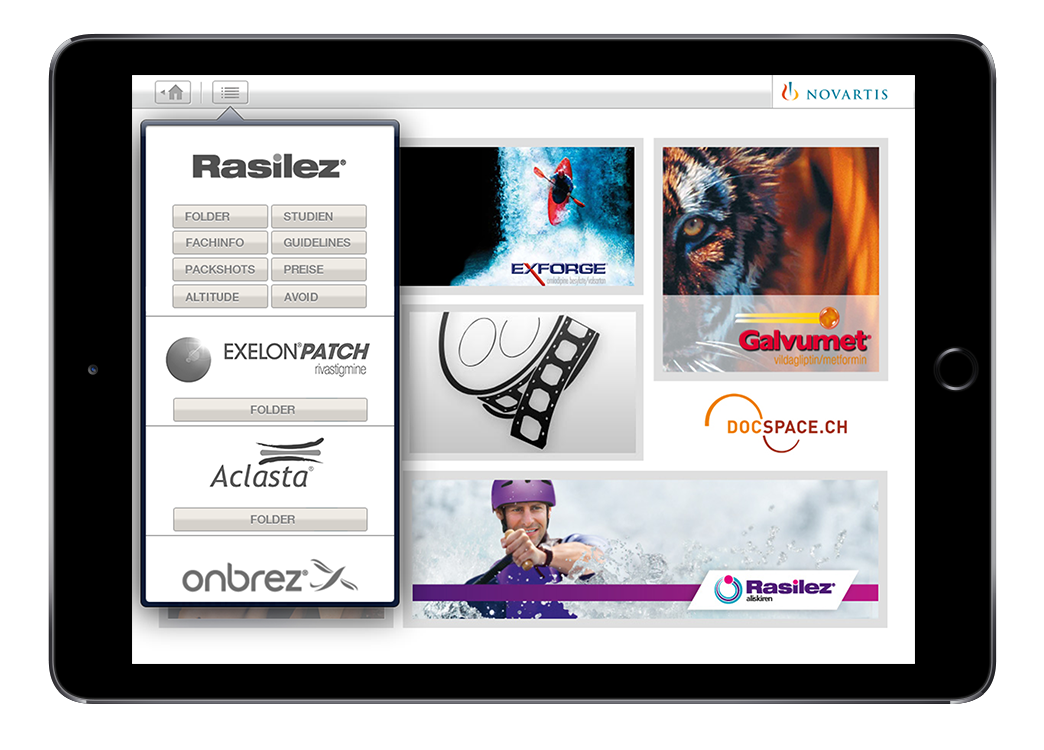 Wir erarbeiteten gemeinsam mit der Kommunikationsagentur Ogilvy Interactive die Informationsarchitektur und die grafische Benutzeroberfläche der Applikation. Anschliessend erfolgten die programmiertechnische Umsetzung und das Deployment. Die App ist ausschliesslich inhouse auf den Tablets der Aussendienstmitarbeitenden von Novartis Pharma Schweiz verfügbar.